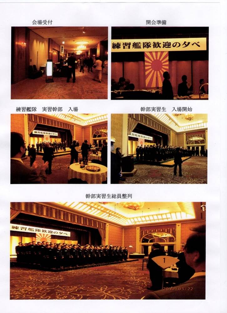 日 時:平成24年3月22日(木)17:50~20:00 場 所:シェラトン都ホテル大阪「浪速の間」 大阪市天王寺区上本町6−1−55 招待者:練習艦隊司令官ほか主要幹部:実習幹部 約200名 関西地区所在部隊指揮官等 特別出演:宝塚歌劇団 行事概要:1750 開会、練習艦隊入場出迎え 1800 歓迎の辞,謝辞 関西出身実習幹部紹介 実習幹部代表謝辞 花束贈呈 宝塚歌劇団出演 1830 乾杯に引き続き開演 1950 万歳三唱 2000 閉会、練習艦隊退場見送り