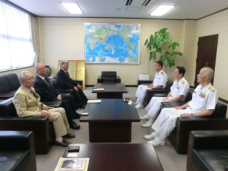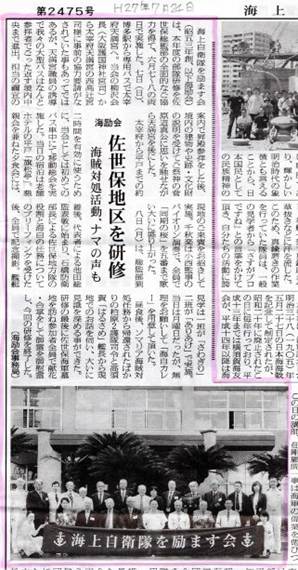 海上自衛隊を励ます会(昭五三年創、以下海励会)は、本年度の部隊研修を佐世保総監部の全面的なご協力を得て、六月七〜八の両日で実施した。七日(日)、博多駅から専用バスで太宰府天満宮へ。当会の柳沢会長(大阪護国神社宮司)から太宰府天満宮の西高辻宮司様に事前の協力要請がなされていた事もあってではあるが、天満宮職員の誘導で我々の大型バスはなんと参拝者でごった返す境内中央まで進出。担当の禰宜の案内で昇殿参拝をした後、境内の建物や史跡・文化財の説明を受けてご祭神の菅原道真公に思いを馳せながら天満宮を後にした。 太宰府から平戸までの約二時間を有効に使うために、当会としては初めてのバス車中にて移動総会を実施した。当日の宿泊は老舗ホテルの平戸「旗松亭」。懇親会を兼ねた夕食会には、現地のご来賓をお招きして実施。千秋楽は小西監事のバイオリン演奏で、全員で「同期の桜」を五番まで歌い大いに盛り上がった。 八日(月)は、総監部到着後、代表者による池田総監表敬に始まり、石橋防衛部長による佐世保地方隊の役割と海自の任務についてのブリーフィングを受けた後、全員で記念撮影。艦艇見学は一班が「さわぎり」二班が「ありあけ」で実施。当日は月曜日であったにも拘わらずご無理をお願いして「海自カレー」を用意して頂いた。昼食後、ソマリア海賊対処任務から帰還されたばかりの柏原二護隊司令と高須賀「はるさめ」艦長から現地でのお話を伺い、大いに研修を深める事ができた。研修の最後に佐世保海軍墓地を訪ね参加者全員で献花・合掌をして御霊を御慰霊し、今回の研修を終了した。 (海励会事務局) (海上自衛新聞 2015年7月24日号に掲載していただきました) |