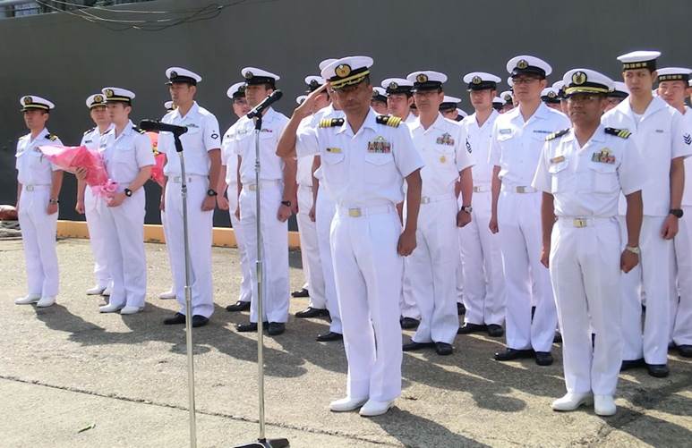 敬礼する第8護衛隊司令 小林知典 一等海佐と、艦長 江畑泰孝 二等海佐