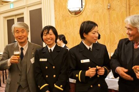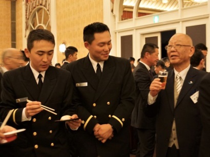 実習幹部と海励会員が談笑 22日夕 ◆神戸港にて「かしま」艦上レセプションに参加