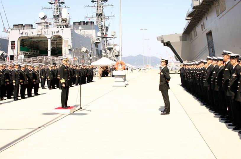 呉地方総監 池 太郎 海将から訓示を受ける 「かが」艦長 遠藤 昭彦 一等海佐と乗員