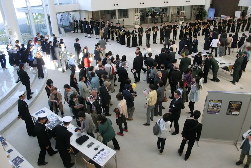 平成29年4月22日、兵庫県小野市のエクラホールに於いて、海上自衛隊呉音楽隊による 「ふれあいコンサート」・呉総監「池太郎海将の特別講演」・「小野市主催の歓迎レセプション」 さらに潜水艦「はくりゅう」による特別広報・自衛隊兵庫地本による「陸海空自衛隊広報行事」が 同時に開催され、大いに盛り上がった。(阪神基地隊からは山崎司令・佐久間副官が出席) 特に今回、港のない地方都市・小野市での呉音楽隊によるコンサートは、まるで突如として 「天女が舞い降りた」ような奇跡(感動と幸運)をもたらした。 小野市に近い県立社高校と三木高校の吹奏楽部とのコラボ演奏は指導教員や保護者にも 大きな感動を与え、そして翌日のパート毎の技術指導では感激で涙する高校生が出たほど。 我が「海励会」からも20名近くが参加し、会場の設営等を手伝いこの大イベントを支えた。