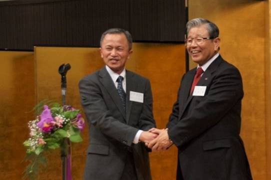 固く握手する、池総監と蓬莱小野市長 演奏会を企画した 小野市防衛協会 橋本副会長 挨拶 (海励会 事務局長)
