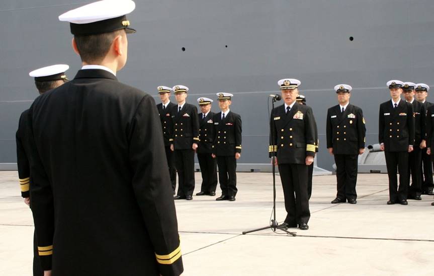 呉地方総監 池 太郎 海将に出港報告する「いせ」艦長 高田 昌樹 一等海佐