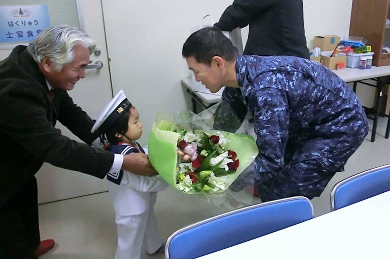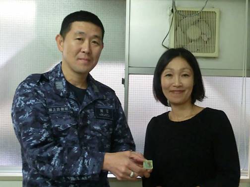 名誉乗員の井上聖菜から開田艦長へ花束の贈呈(於笠松ハウス)