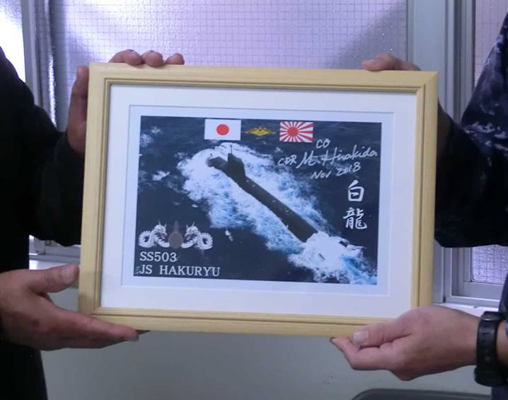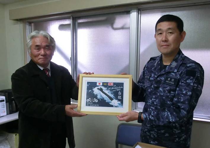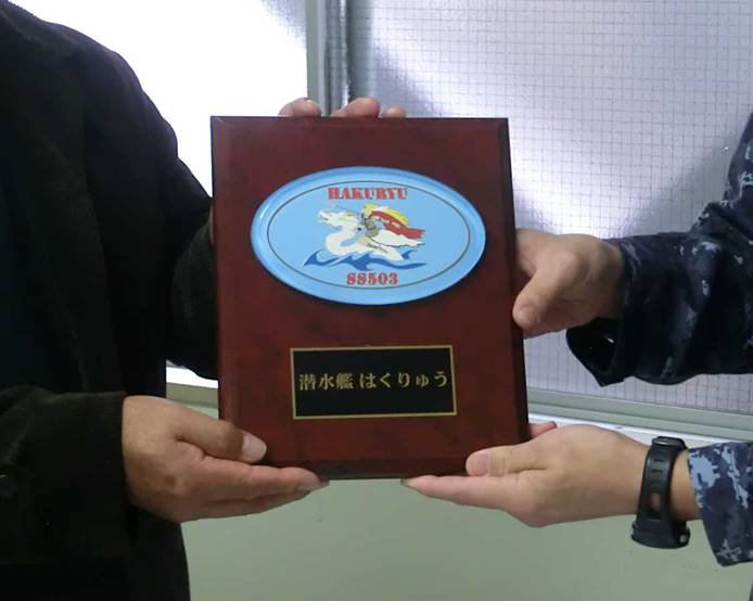 平成30年12月21日(金)、三菱重工業叶_戸造船所にて約3か月に及ぶ年次修理を終えた 潜水艦「はくりゅう」の出港を同造船所のご了解を得て潜水艦岸壁にて見送った。 出港を1カ月後に控えた11月23日(金)、開田益徳「はくりゅう」艦長からのご招待で 「はくりゅう後援会」会員6名と名誉乗員の井上聖菜が、入渠中の宿舎である笠松ハウス に於いてカレーライスをご馳走になりながら歓談をした。 また、記念品として記念バッジ・記念楯・派米訓練に向かう途上、豊後水道上空から空撮した 「白龍」のベストショットの写真を頂いた。 12月8日(土)に開催された阪神基地隊の年末行事でもご一緒でき記念撮影を行った。 実戦モードに入った潜水艦「白龍」の武運長久を祈りたい。 |