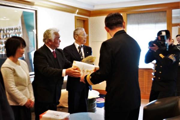 「かしま」艦内で橋本会長より梶元司令官に記念品贈呈