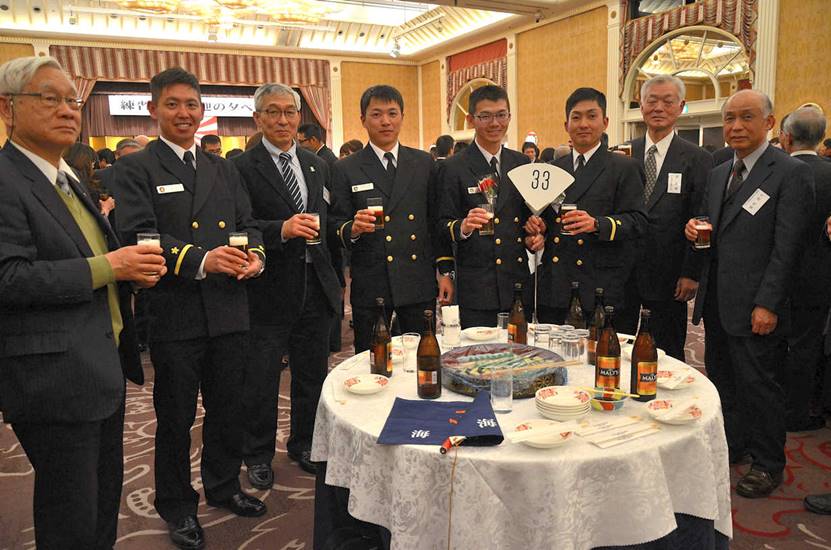 「練習艦隊歓迎の夕べ」で、我々のテーブルに来てくれた実習幹部の森永3尉は回転翼のパイロットを志しており、 偶然にも同じく回転翼パイロットを目指している、名取理事の令息(名取3尉)とは、防大時代の寮では同室で 『名取先輩には大変可愛がって頂きました』と名取理事に挨拶し、名取先輩を非常に尊敬していたとの事。 更に加えて、菊地英夫顧問と同じカッター部に所属していた事もわかり、歓迎会終了後は当然の如く、 菊地顧問が大喜びをして孫のような森永3尉をお持ち帰りした。 |