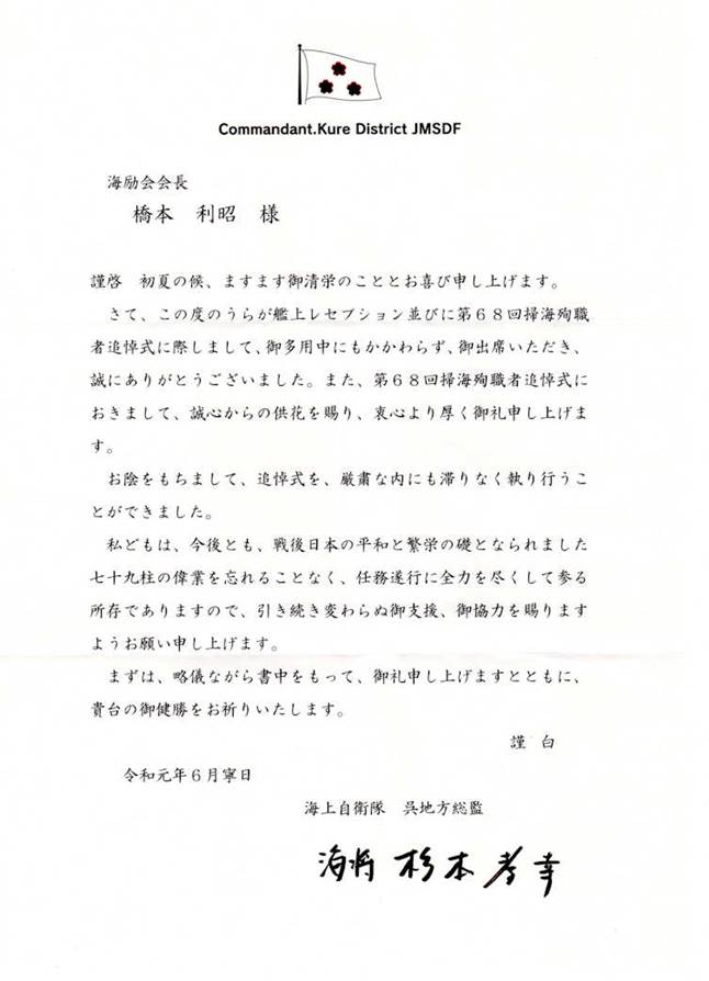 令和元年5月25日、香川県の金刀比羅宮で第68回掃海殉職者追悼式が実施された。