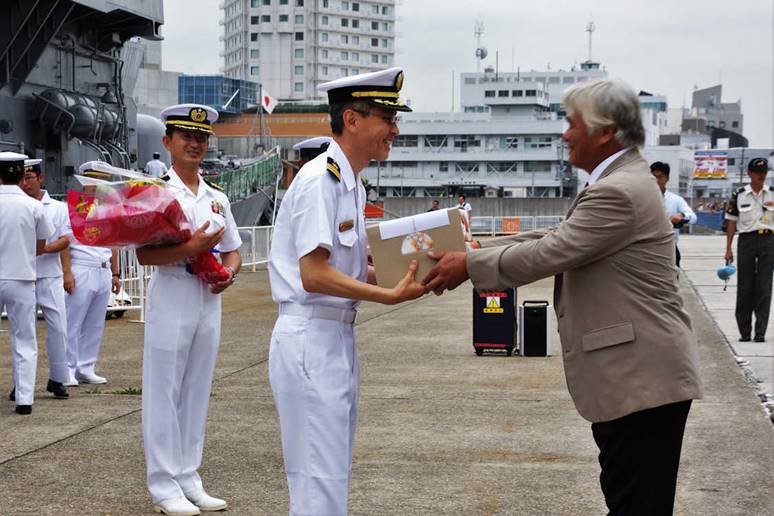 練習艦「やまゆき」艦長 鳥羽2佐に橋本会長より記念品贈呈 花束を持たれているのは、第1練習隊司令 遠藤1佐