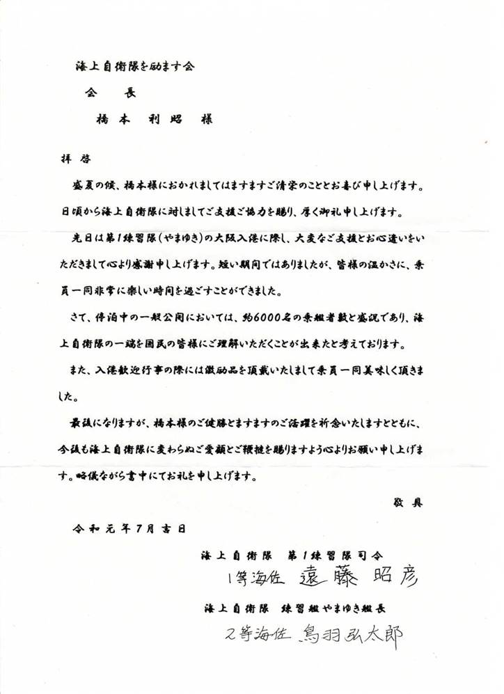令和元年7月13日(土)朝、「海の日」の記念イベントとして、第1練習隊司令・遠藤昭彦1佐を指揮官に 大阪港には「やまゆき」(艦長・鳥羽弘太朗2佐)が、姫路港には「しまゆき」(艦長・齋藤岳彦2佐)が それぞれ入港し、支援団体や海自ファン・一般市民から熱烈な歓迎を受けた。 海励会は大阪地本からの要請もあり大阪港にて「やまゆき」の入港歓迎式に参加した。 また両艦には、防衛大学校2年生が初めての乗艦実習として乗組んでいた。 |