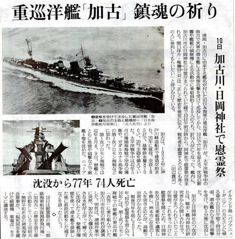 令和元年8月10日、加古川市の日岡神社にて、77年前のこの日、ソロモン海域で戦没した重巡洋艦「加古」の 慰霊祭が営まれ、遺族会・神社惣代会・海励会を含む多数の関係者が参列した。