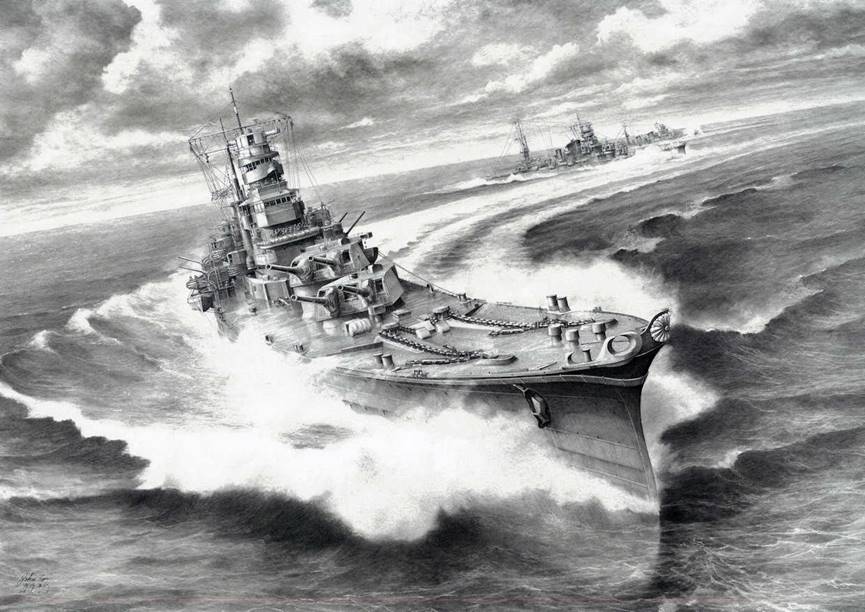 菅野泰紀氏より日岡神社に奉納された 重巡洋艦「加古」の精密鉛筆画 「海征く牙狼」 (菅野泰紀氏 画像提供) |