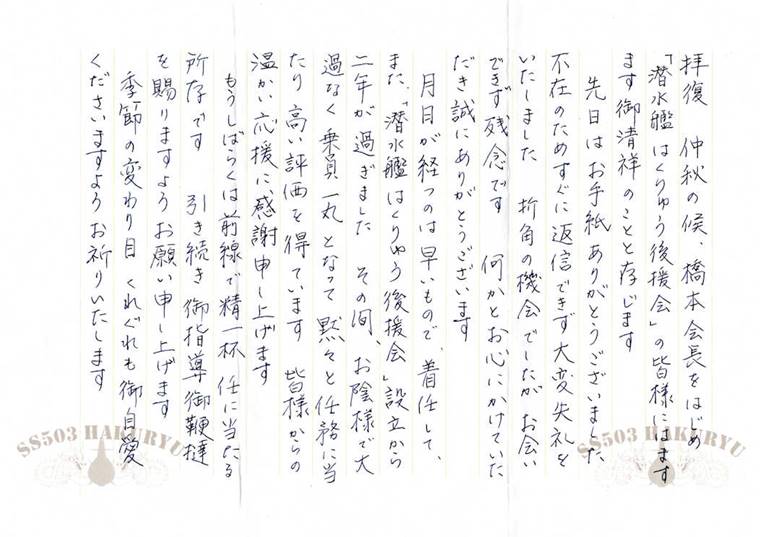 令和元年10月15日、潜水艦はくりゅう開田益徳艦長より自書による達筆且つ丁寧な返書が