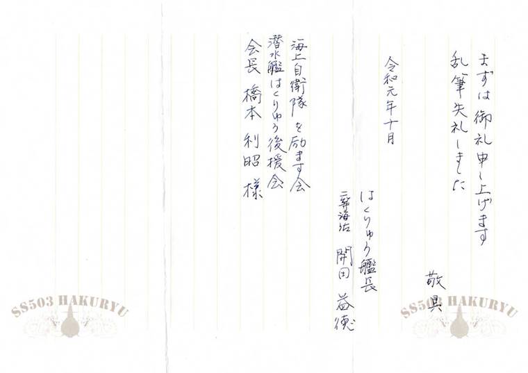 潜水艦「はくりゅう」艦長から頂いた手紙 (2019年10月15日)