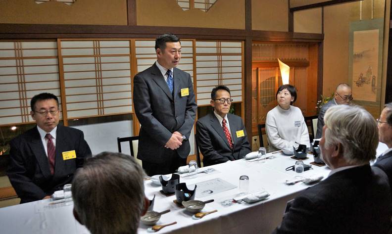 霞月楼女将・堀越喜久枝氏から挨拶を受けられる六車学校長