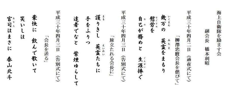 故柳澤忠麿前会長の通夜式並びに告別式にて橋本会長が鎮魂歌として詠んだ歌 |