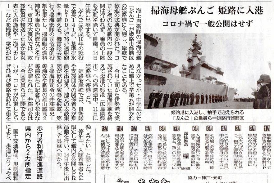 新型コロナの影響で一般公開はなかったが、停泊中、兵庫地方協力本部による 艦艇広報が実施され、入隊予定者等に対し、特別公開も行われた。 14日(日)、「海上自衛隊を励ます会」他、支援団体に見送られて姫路港を出港した。 |