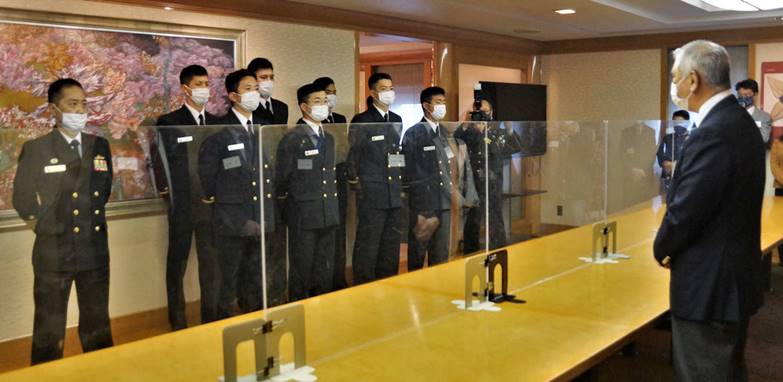 かしま」司令官公室にて歓迎式に臨む各支援団体代表