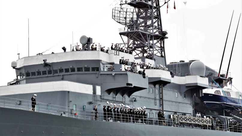 岸壁の見送りに『有難うございました』と「帽ふれ」で応える実習幹部と「かしま」乗員。 小牟田司令官は「かしま」旗甲板上から「帽ふれ」をされている。 |