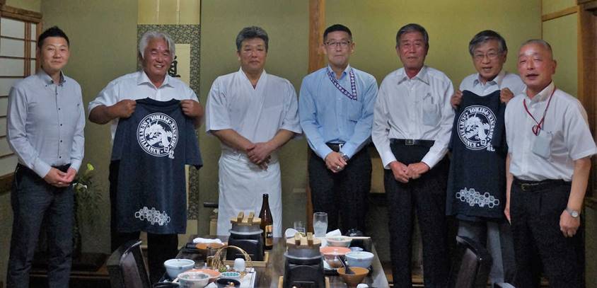 向かって左より宮地さん、橋本会長、五月荘主人、開田さん、上谷理事、岸本事務局長、山中理事 |