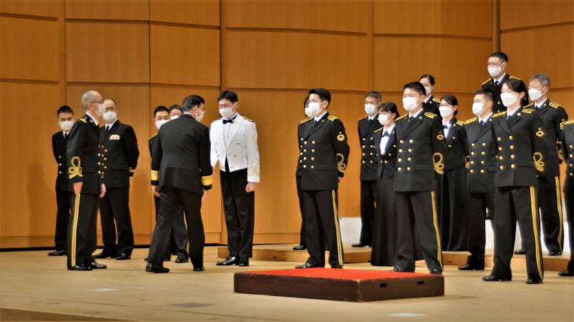 演奏後、音楽隊員を激励される舞鶴地方総監 下淳市 海将