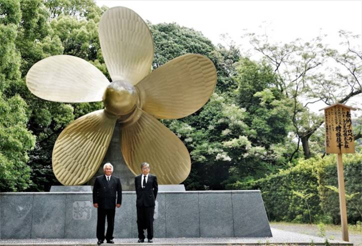 奉納プロペラ前での橋本会長と岸本事務局長 |