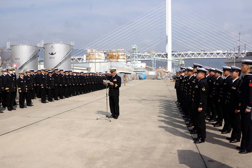 阪神基地隊東岸壁に入港して、第42掃海隊に編入され、挨拶をされる「あおしま」艇長 星野優希3等海佐