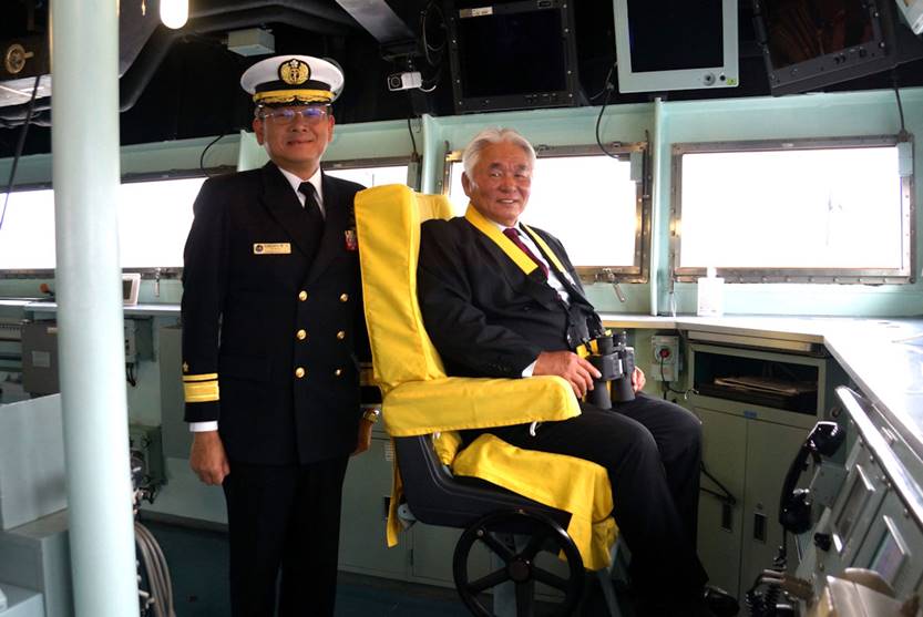 第2護衛隊群司令 海将補 清水 徹 様と、艦橋の司令席に収まる橋本会長 |