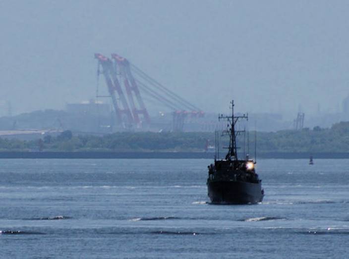 遠くに見える掃海艇「なおしま」から発光信号 「安全なる航海を祈る!」