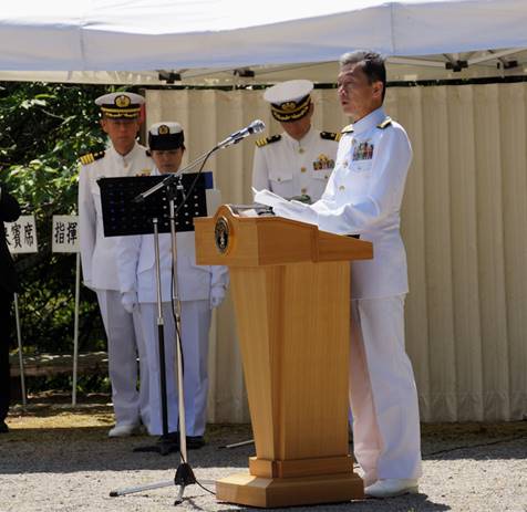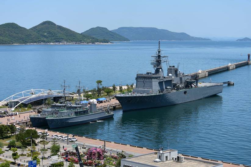 掃海母艦「うらが」と掃海艇「あおしま」、「みやじま」 (5月25日 東野一志氏撮影) 5月25日 掃海殉職者追悼式