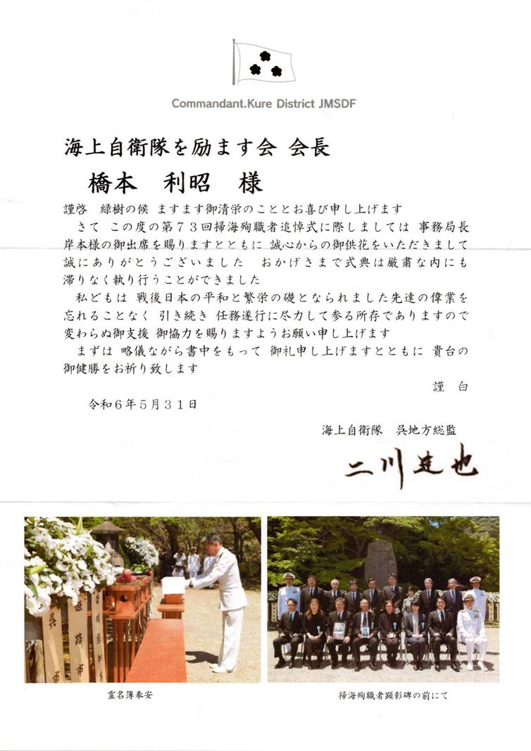 令和6年5月25日、香川県の金刀比羅宮で第73回掃海殉職者追悼式が実施された。 前日には、高松港にて掃海母艦「うらが」艦上レセプションが開催された。 海励会からは所用で参列できない橋本会長名代として岸本事務局長、および1名が参列。 |