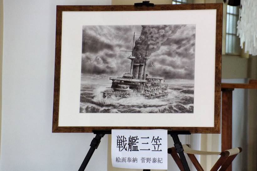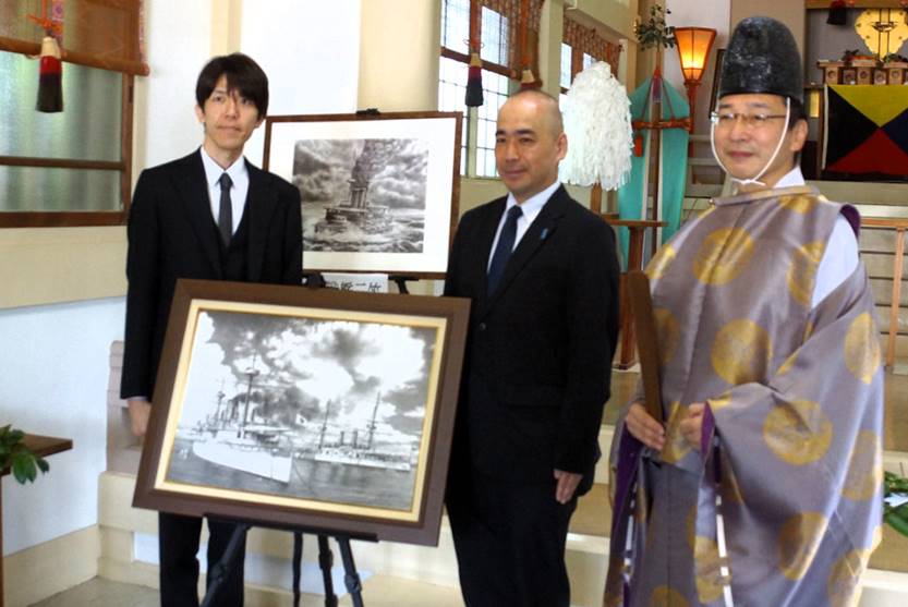 菅野画伯 (海励会員) 作成の、東郷艦長率いる巡洋艦「浪速」の絵画が奉納された。