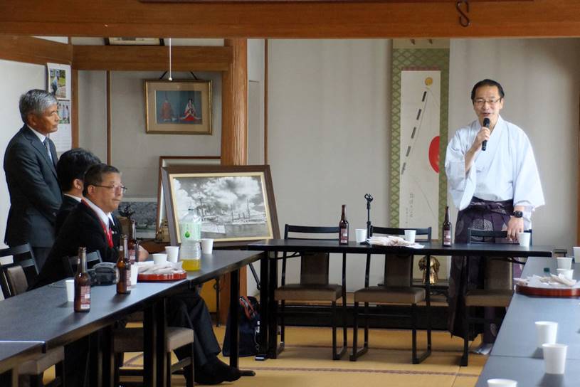 東郷祭後の懇親会で挨拶される藤江宮司 (海励会顧問)