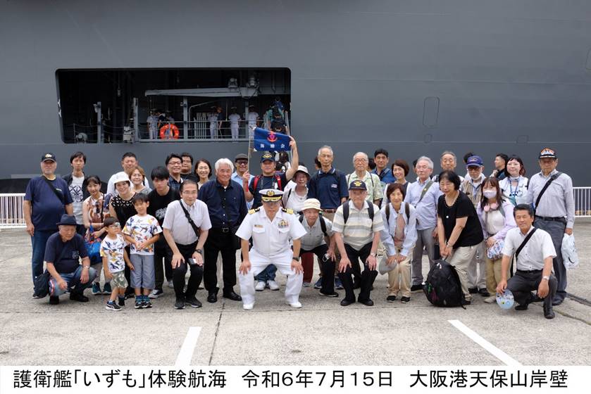 令和6年7月15日(月)朝、呉総監部創設70周年記念行事の一環として待ちに待った体験航海が行われた。 大阪港天保山クルーズ船岸壁から「空母いずも」が、阪神基地隊岸壁からはイージス艦「まや」が、 和歌山港からは汎用護衛艦「あきづき」がそれぞれ大阪湾に向け出港し体験航海を行った。 海励会からは支援団体最大の40名が招待を受け参加した。 |