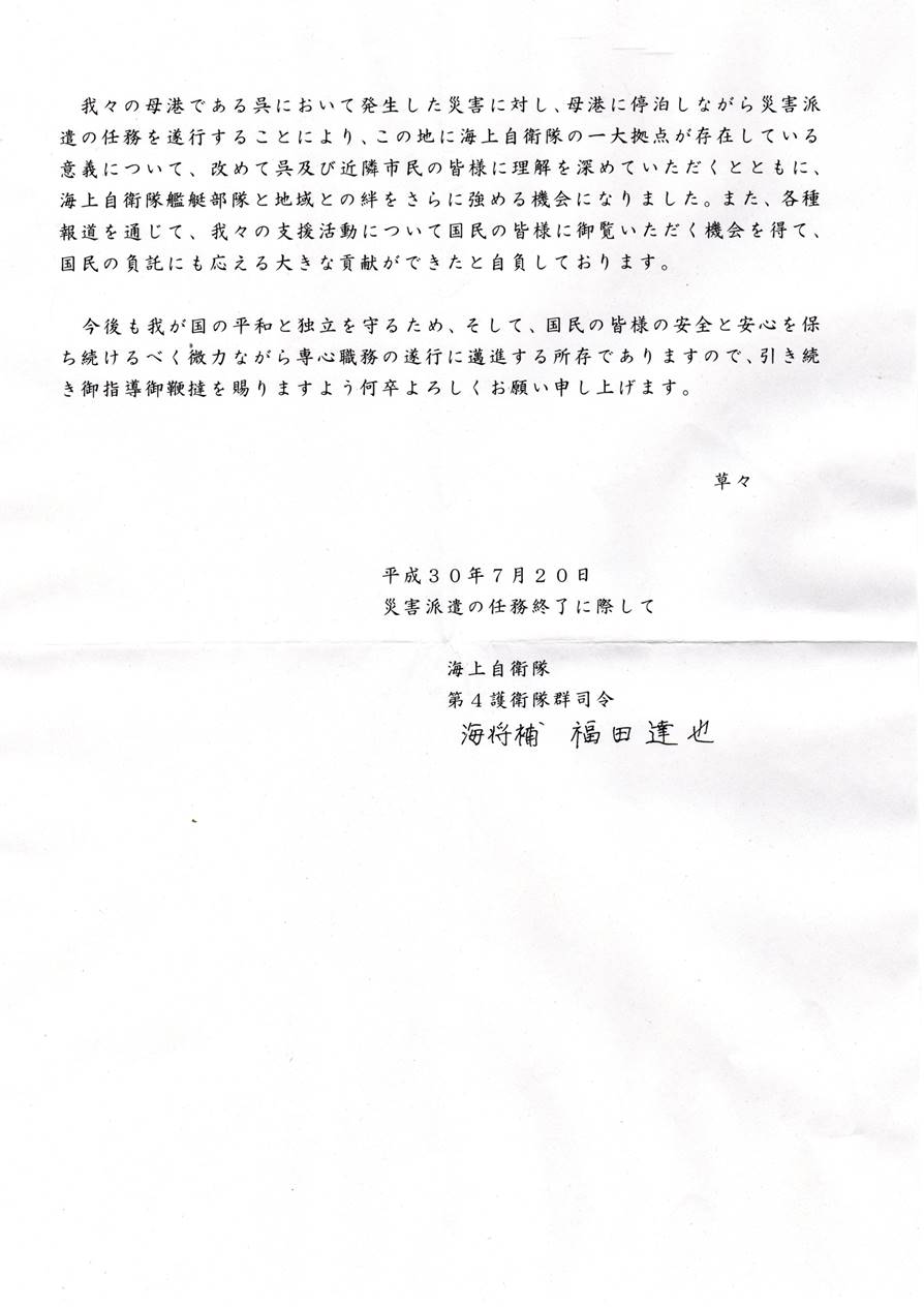 西日本豪雨災害に対する呉地方隊の対応 (平成30年7月)